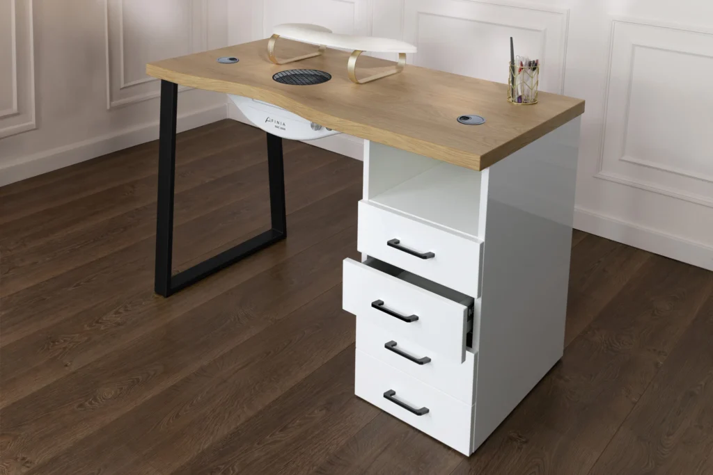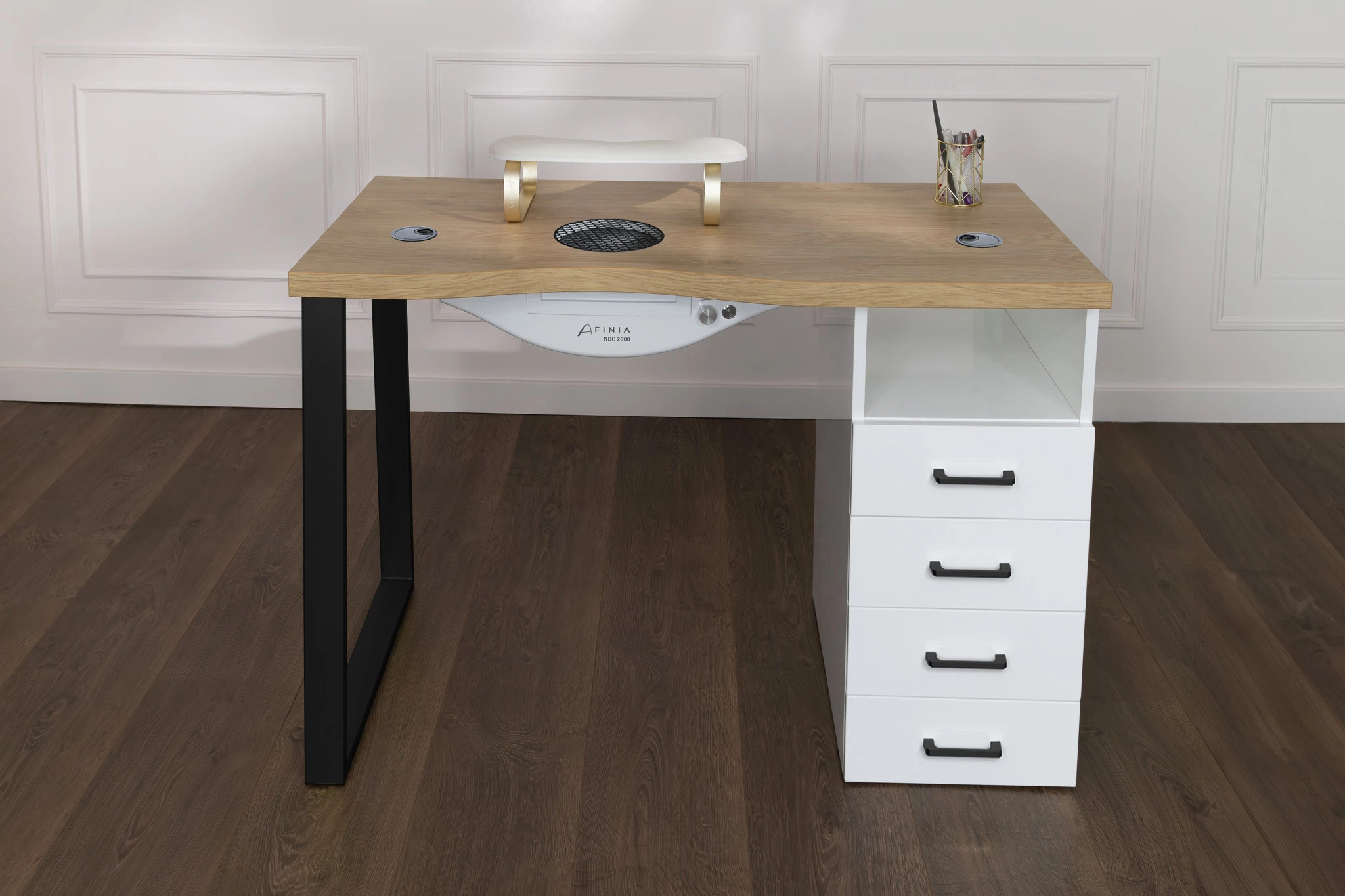 Der Nageltisch Afinia Natural Black ist ein funktionaler Arbeitsplatz, der für Nagelstylistinnen und professionelle Kosmetiksalons entwickelt wurde. Moderne Ästhetik, Ergonomie und Funktionalität. Der Tisch passt perfekt in stilvolle, saubere und helle Innenräume.